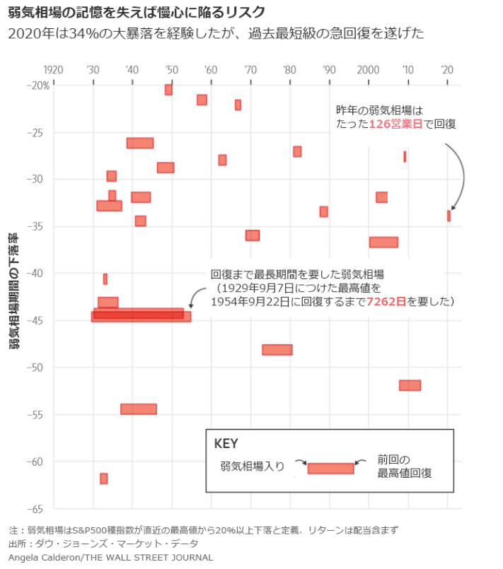 一年前のウォールストリートジャーナルの記事ですが(参照元)、これによると、コロナによる弱気相場ではたった126営業日で回復してます(下図参照)。ただ、過去振り返ると、最長を要した弱気相場からの回復期間は、1929年9/7から1954年9/22と、7262営業日かかっています。営業日以外もいれると、期間としてざっと25年はかかっています。