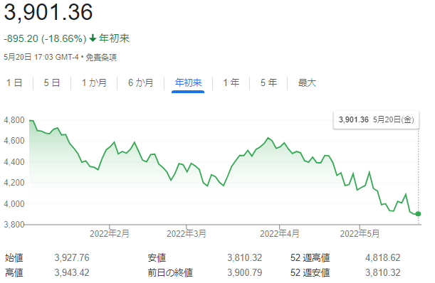 5/20のSP500は弱気相場入りを回避しました(ブルームバーグ記事)。ただ、今後のQTと利上げでまだまだ安心はできなそうですね。。