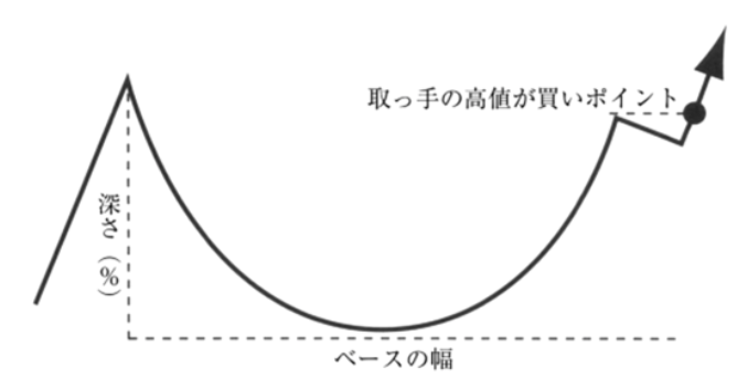 ・取っ手部分は、1-2週間以上かけて形成される。また下落する値動きの終わり付近で「ふるい落とし」が起こる。株価はその数週間前に作られた取っ手の安値を下回る